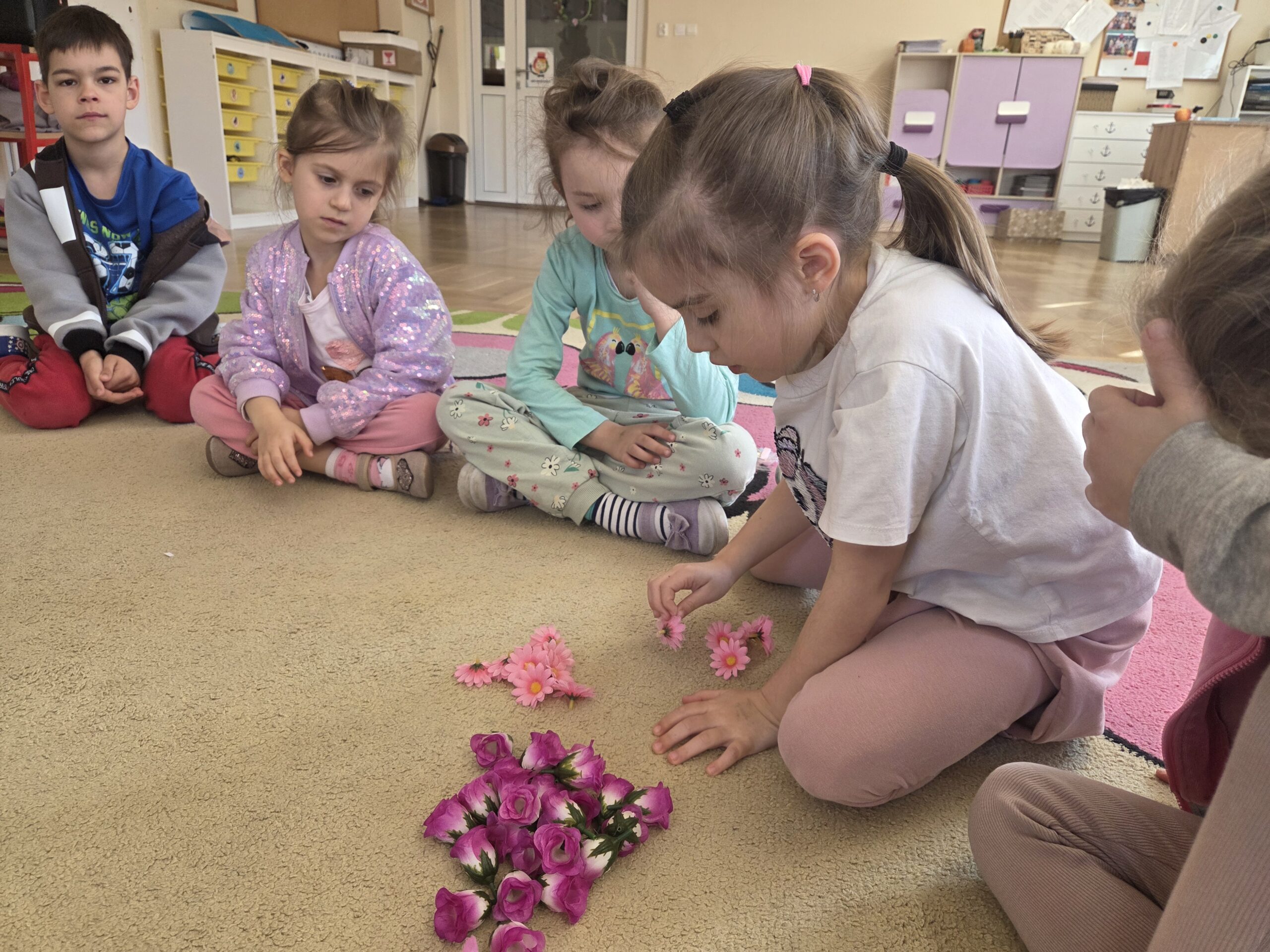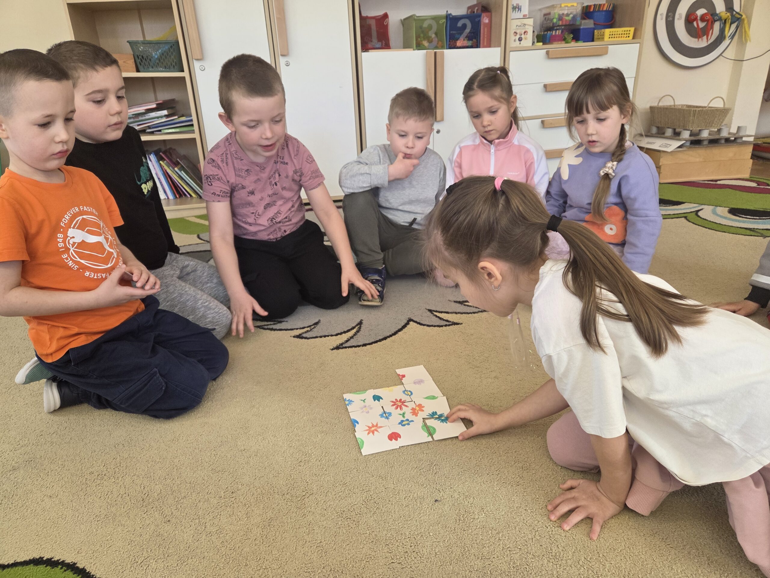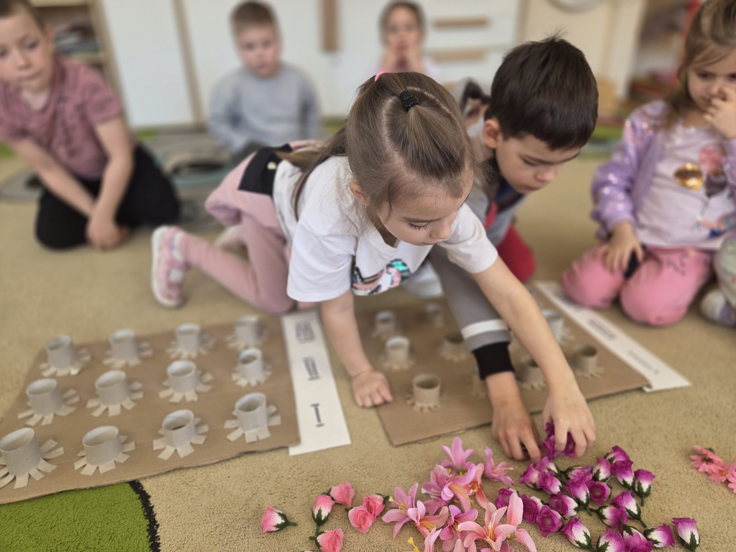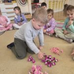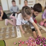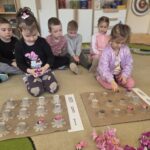 Kwiaty stały się także inspiracją do rozwijania umiejętności matematycznych – liczyliśmy, porównywaliśmy wielkości oraz układaliśmy elementy w odpowiedniej kolejności. Wspólne układanie wiosennych puzzli rozwijało u dzieci myślenie logiczne i przestrzenne oraz uczyło współpracy.
