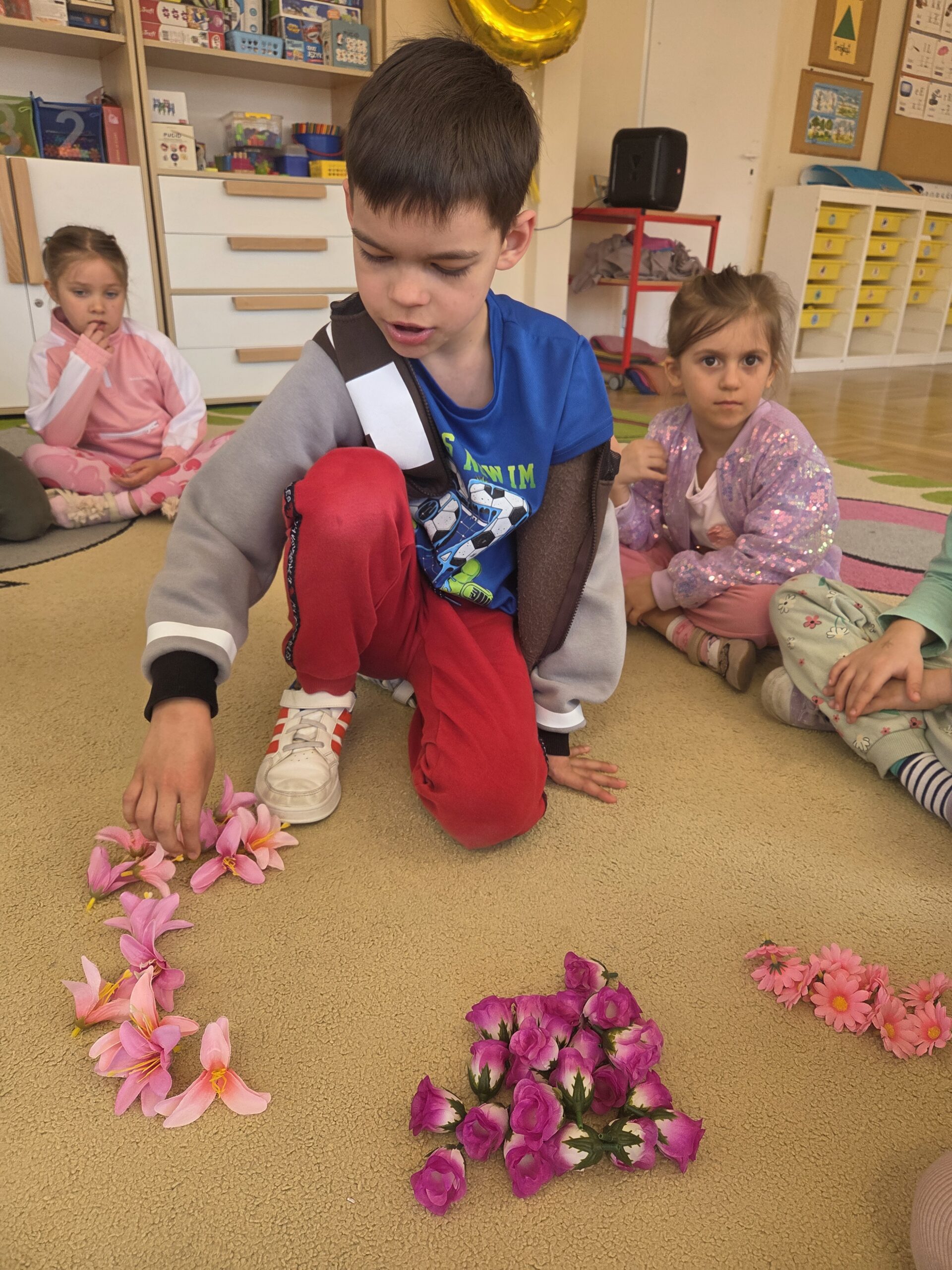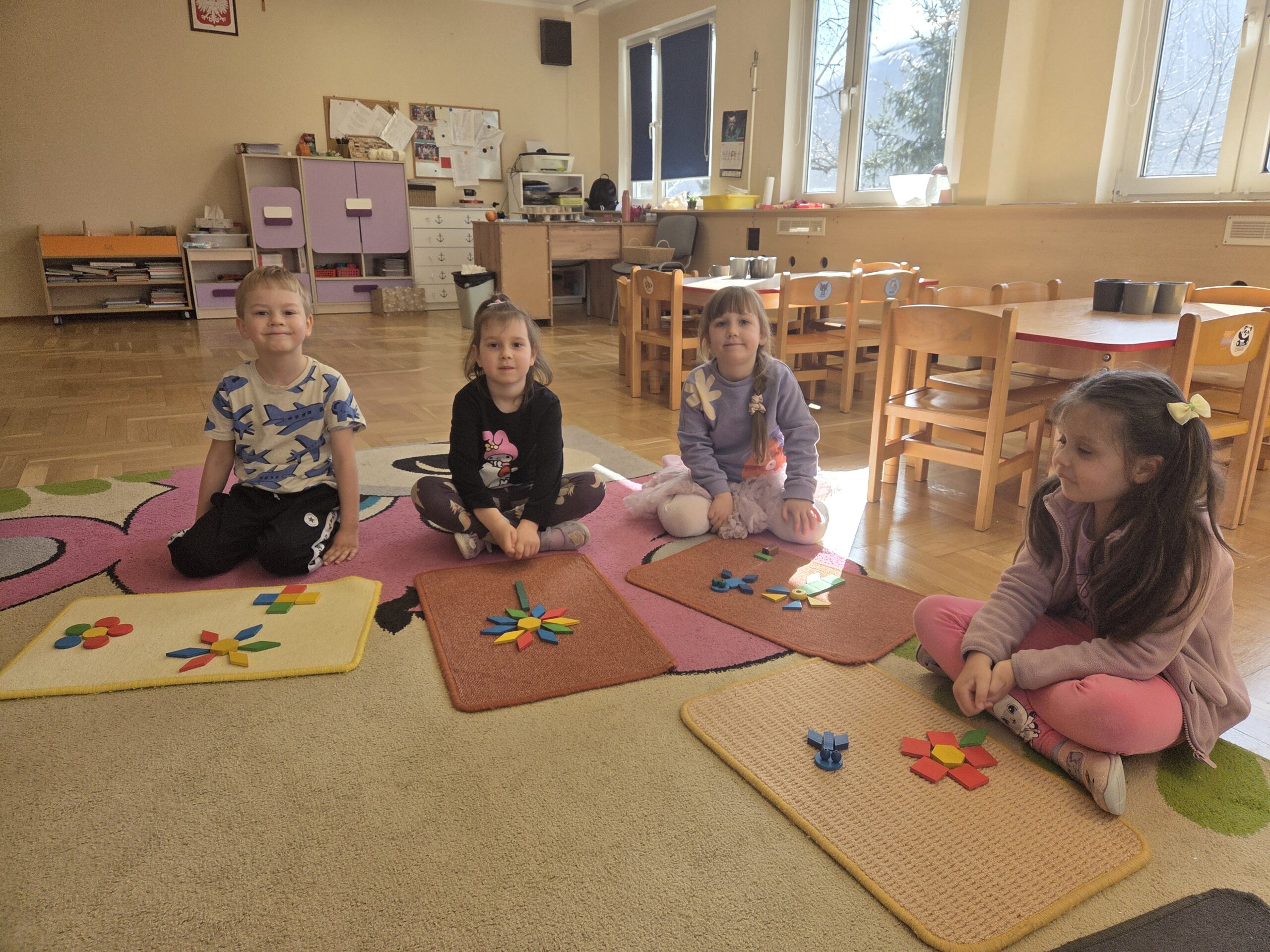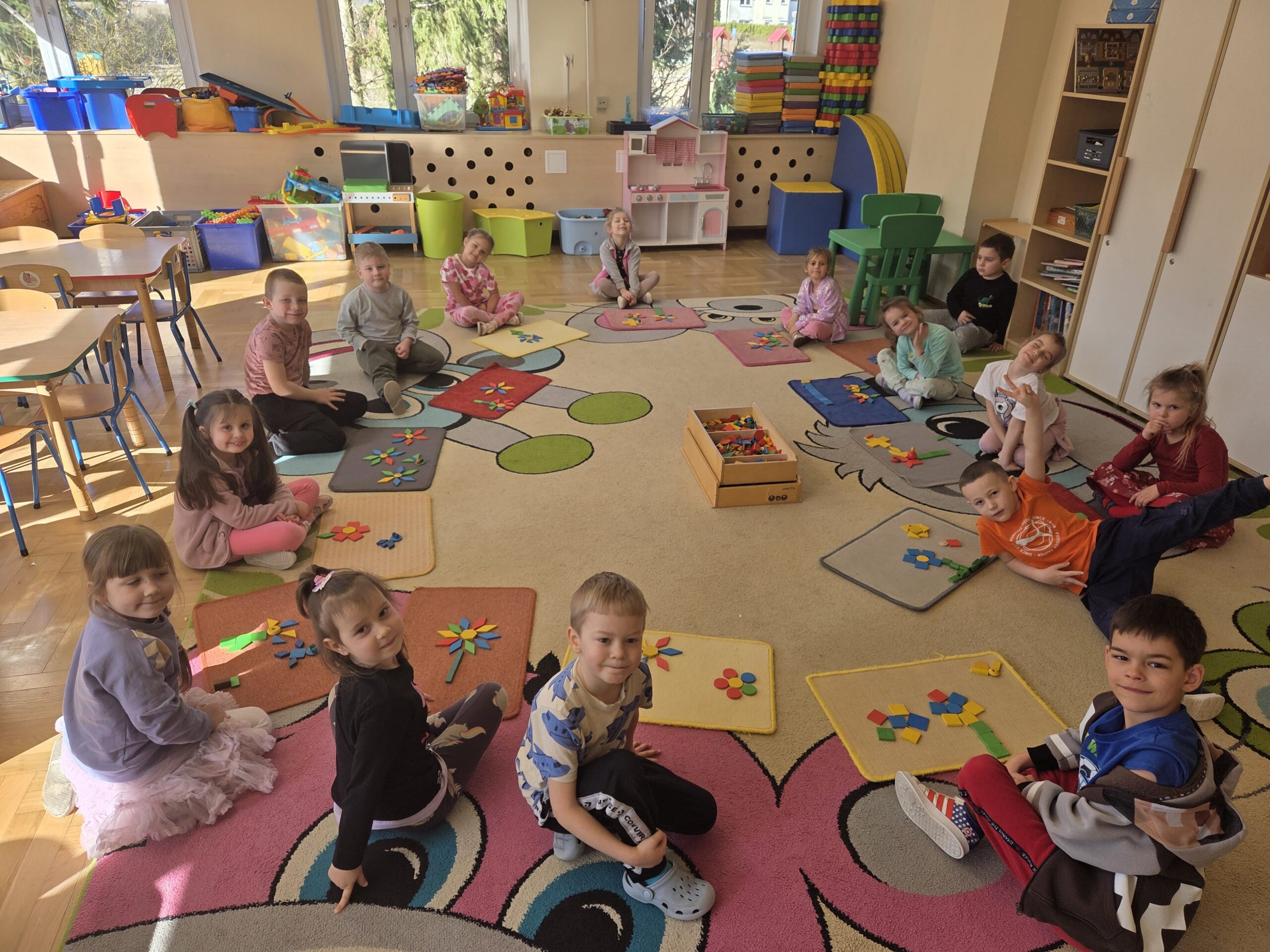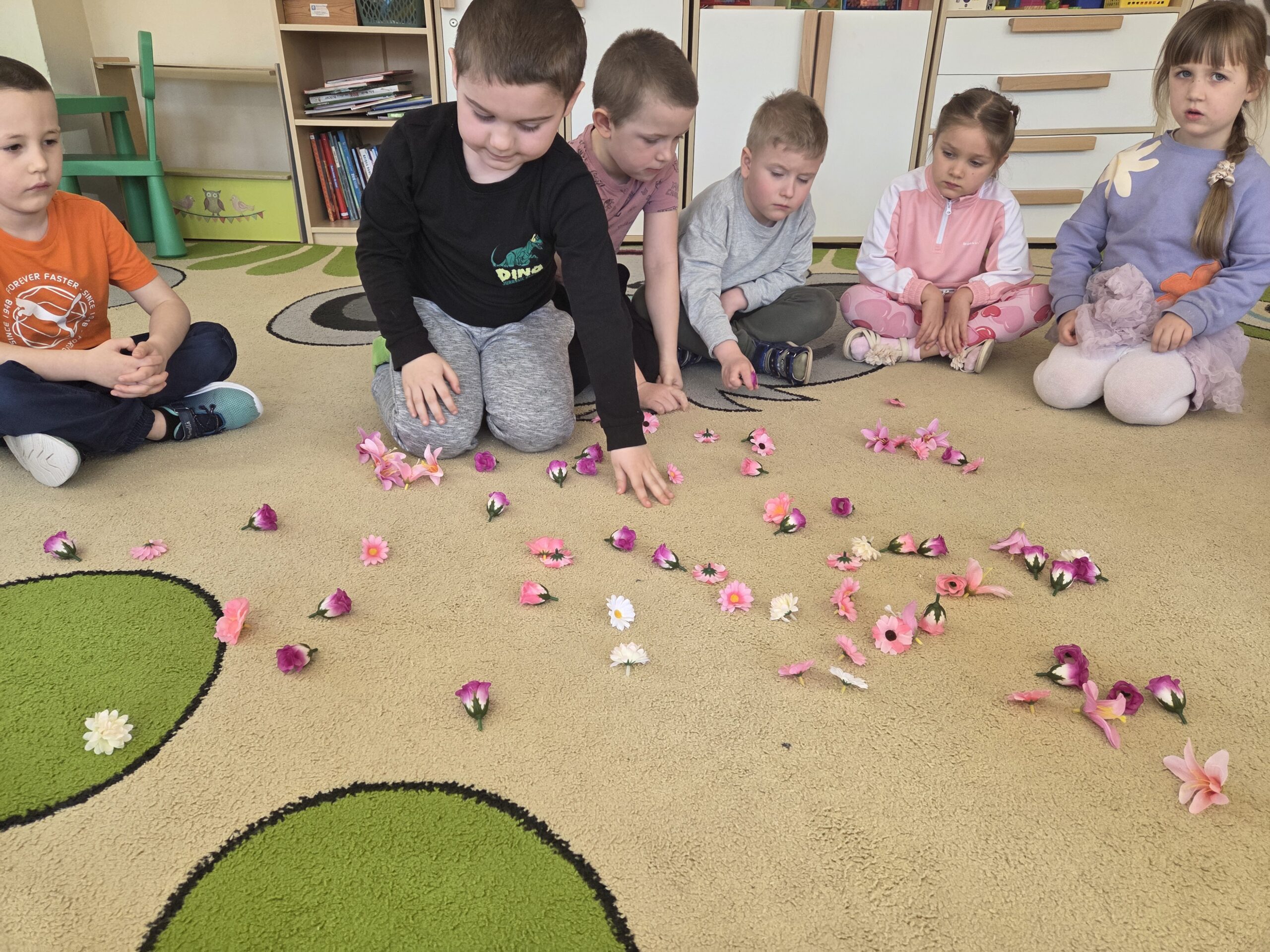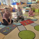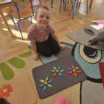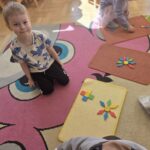 Podczas zajęć Marynarze rozwiązywali zagadki słuchowe związane z kwiatami, dzięki czemu poszerzali swój zasób słownictwa dotyczący roślin. Dzieci z dużym zaangażowaniem odwzorowywały poznane kwiaty – zarówno na kartkach papieru, jak i na dywanie, tworząc ich kształty z figur geometrycznych.