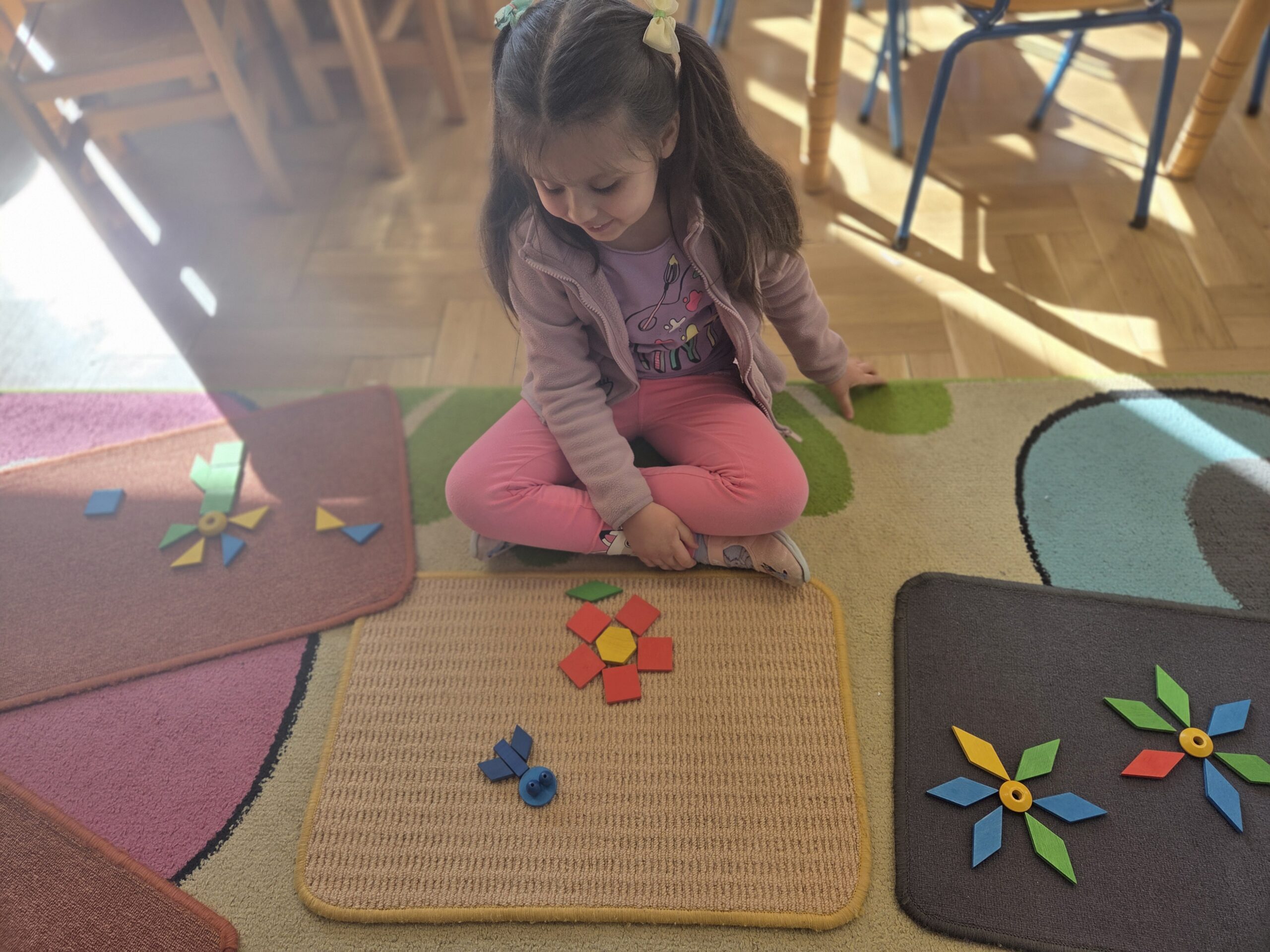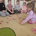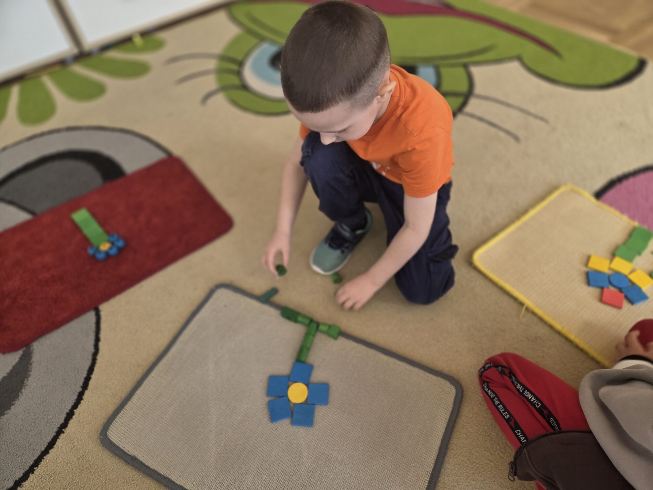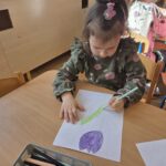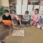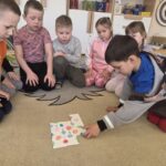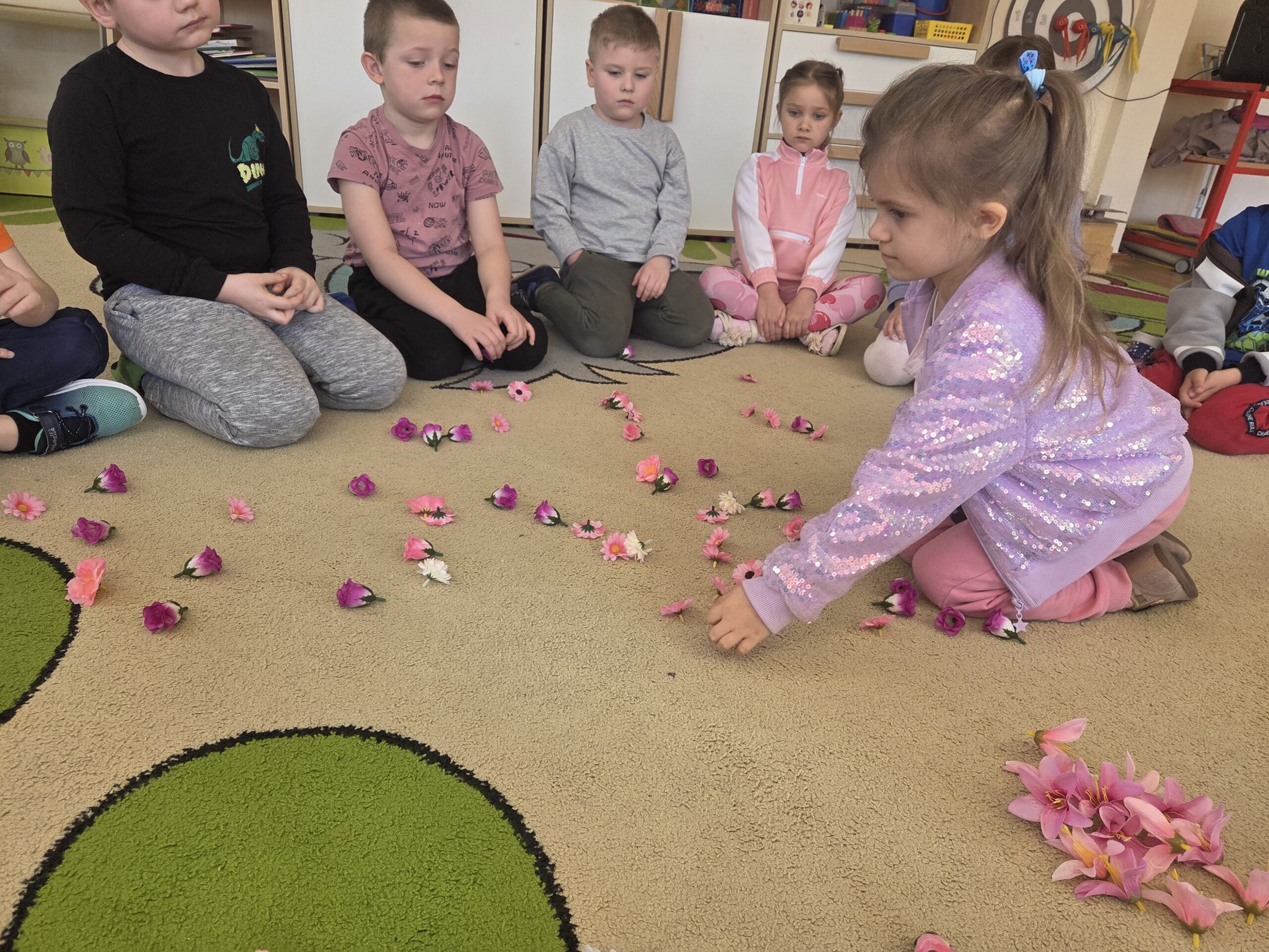 Podczas zajęć Marynarze rozwiązywali zagadki słuchowe związane z kwiatami, dzięki czemu poszerzali swój zasób słownictwa dotyczący roślin. Dzieci z dużym zaangażowaniem odwzorowywały poznane kwiaty – zarówno na kartkach papieru, jak i na dywanie, tworząc ich kształty z figur geometrycznych.