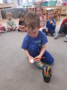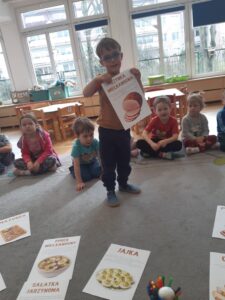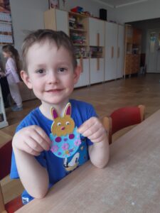 Podczas zajęć dzieci poznały tradycje i zwyczaje wielkanocne. Rozmawialiśmy o symbolach świąt oraz o tym, jak przygotowujemy się do Wielkanocy. Przedszkolaki wykonały również pisanki z makaronu, rozwijając przy tym kreatywność oraz sprawność manualną. Dzieci poznały także zwierzęta żyjące na farmie oraz brały udział w zabawach rozwijających pamięć. Podczas różnych aktywności ćwiczyły motorykę małą i dużą, a także rozwijały umiejętności matematyczne poprzez przeliczanie, porównywanie i klasyfikowanie. Zajęcia przebiegały w miłej, radosnej atmosferze, łącząc naukę z zabawą. Mateuszowi, który obchodził swoje urodzinki jeszcze raz życzymy wszystkiego co najlepsze i najpiękniejsze.
