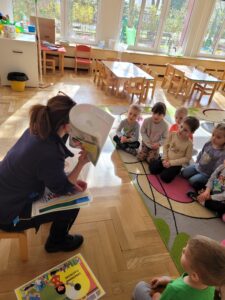 Poznaliśmy piosenkę Dziwne rozmowy i na jej podstawie naśladowaliśmy odgłosy różnych zwierząt. Bawiliśmy się też przy muzyce. Słuchaliśmy wiersza Kaczka Dziwaczka J. Brzechwy i rozmawialiśmy na temat jego treści.