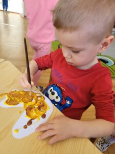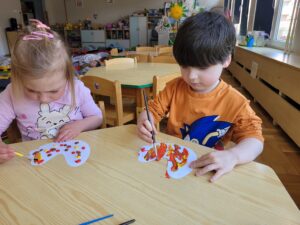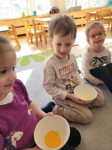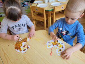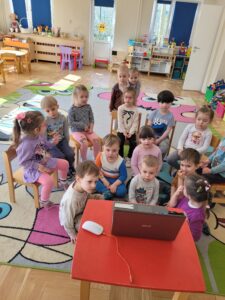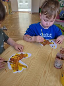Podczas zabaw wykonywaliśmy liczne ćwiczenia usprawniające koordynację ruchową, a także kształtujące prawidłową postawę ciała. Dostosowywaliśmy swoje ruchy do słuchanej melodii.