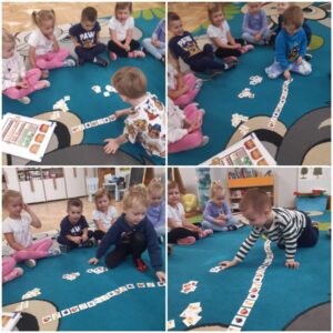 Ostatni tydzień grupa „Muszelek” poświęciła zajęciom związanym z tematyką jesieni i owoców. Dzieci poznawały podstawowe jesienne owoce – ich nazwy oraz wygląd i przekrój. Układały rytmy z owoców, rozwijając spostrzegawczość i logiczne myślenie. W zabawach sensorycznych bawiły się piaskiem kinetycznym, a także odgadywały owoce, ćwicząc zmysł dotyku i koncentrację. Z darów jesieni tworzyły różnorodne figury, a w ramach aktywności plastycznej przygotowały własne prace inspirowane tematyką owoców. Podczas zajęć świętowaliśmy również urodziny Kubusia – dzieci wspólnie się bawiły, złożyły mu życzenia i zaśpiewały tradycyjne „Sto lat”.