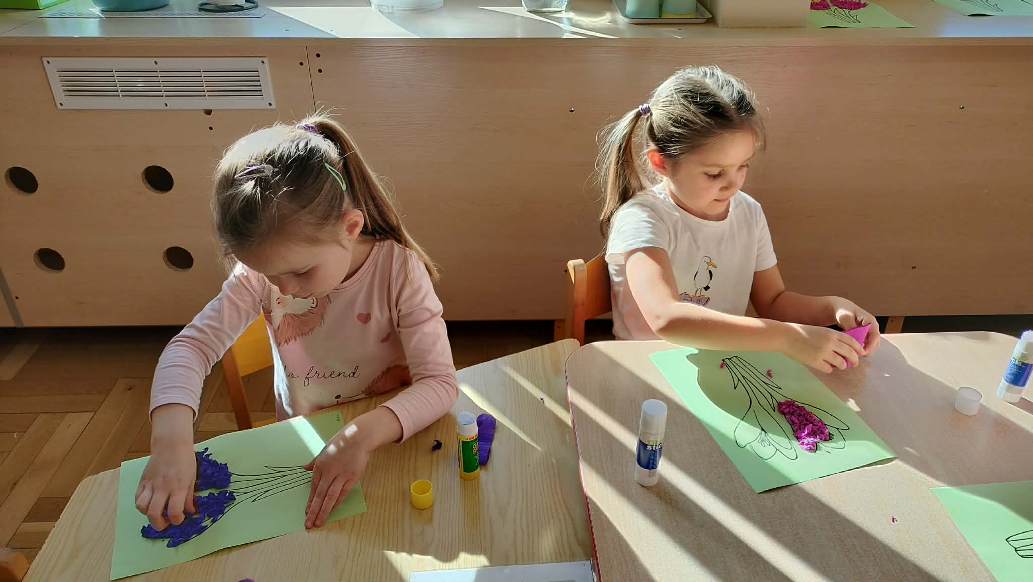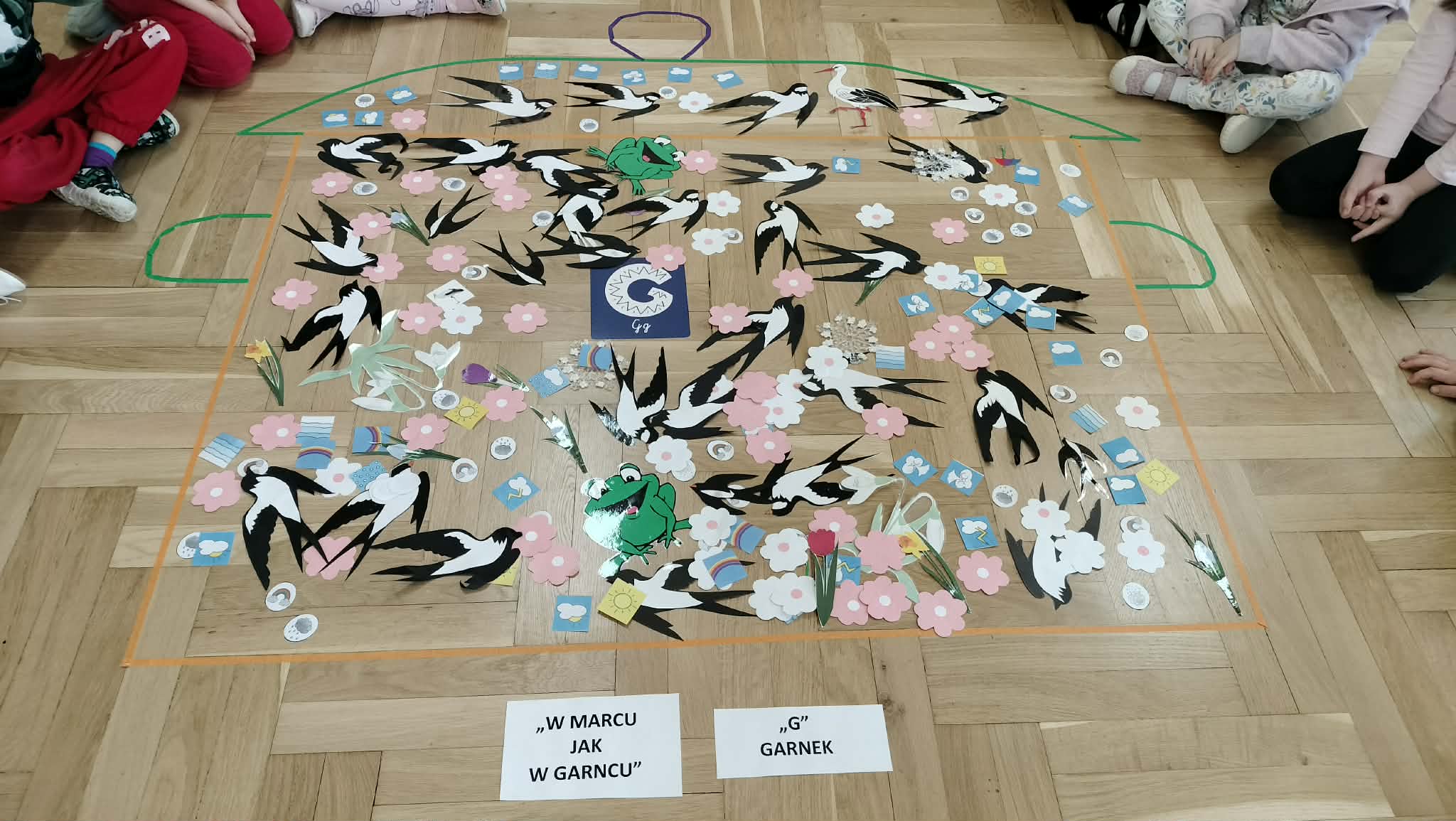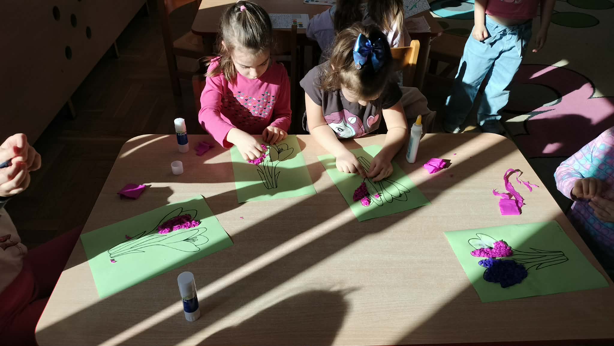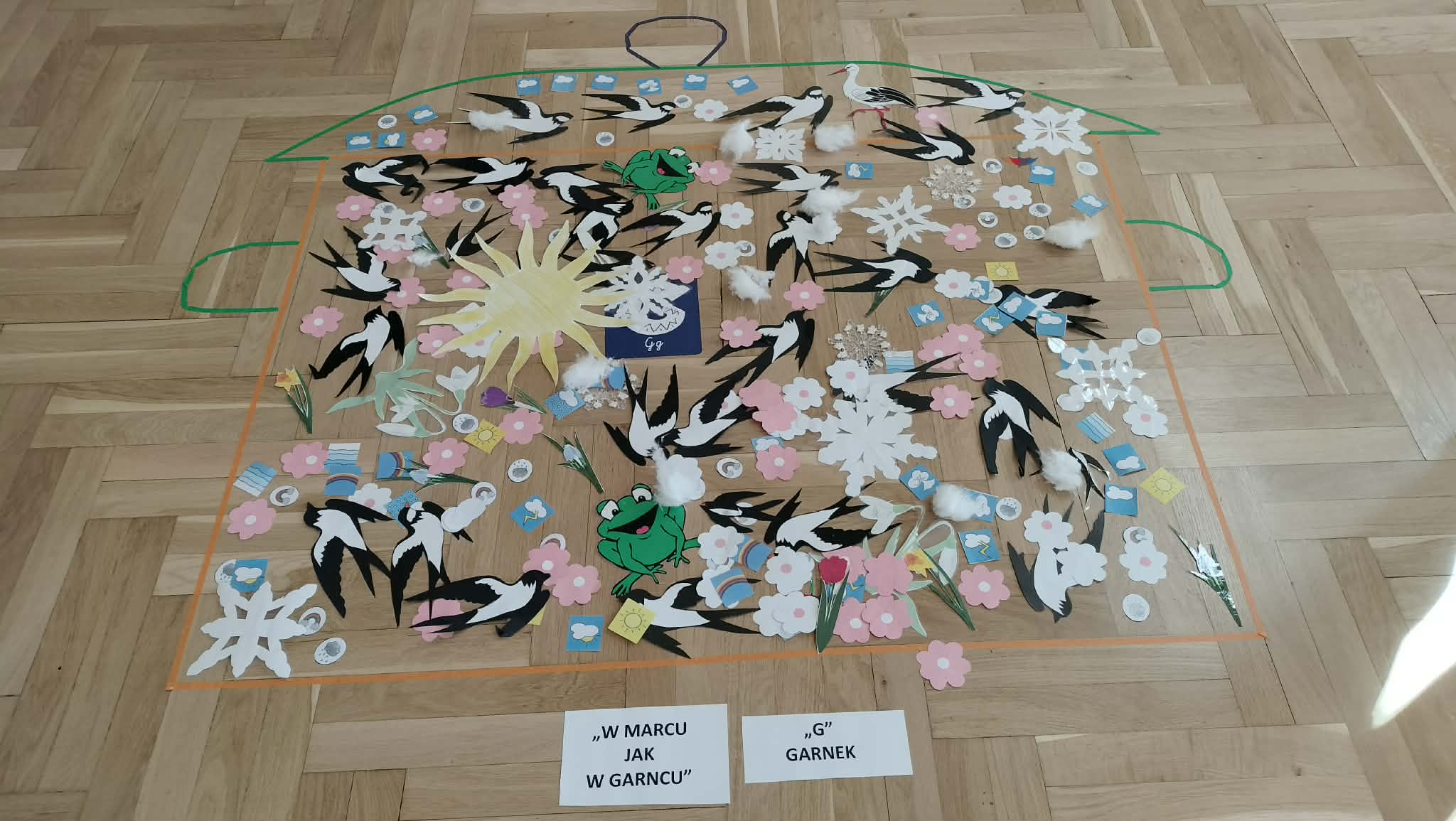 W minionym tygodniu dzieci zapoznały się z przysłowiem „W marcu jak w garncu”, rozmawiały o zmiennej, o zwiastunach nadchodzącej pory roku, o wiosennej pogodzie oraz układały własny „garnek z pogodą”, dopasowując różne zjawiska atmosferyczne. Wykonały również pracę plastyczną przedstawiającą krokusa – jeden z pierwszych zwiastunów wiosny. Podczas zajęć dzieci utrwalały kolejność dni tygodnia oraz rozwiązywały zagadki związane z nadchodzącą porą roku. W tym czasie poznały także nową literkę – G, g, ćwicząc jej rozpoznawanie i poprawną wymowę. Cały tydzień sprzyjał rozwijaniu wiedzy o przyrodzie, spostrzegawczości oraz umiejętności językowych. W naszej grupie świętowaliśmy również „Dzień kobiet”. Chłopcy złożyli dziewczynkom serdeczne życzenia, a wspólne świętowanie upłynęło w miłej i radosnej atmosferze.